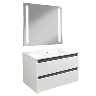 LIEFERUMFANG – BadeDu BYK Waschbecken jeglicher Keramik mit Waschtischunterschrank hängend 80 cm, bestehend jeglicher 2 Schubladen, 3×2 Blenden, 1 Korpus und LED-Badspiegel mit Beleuchtung 80cm trunken