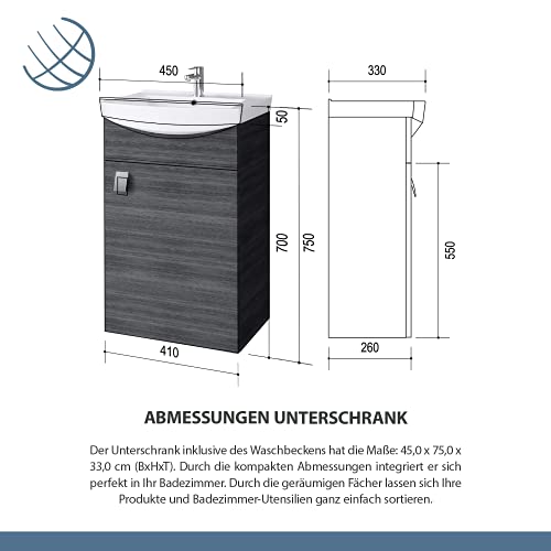 MAßE: Der Unterschrank hat die Abmessungen Breite 41 cm x Höhe 70 cm x Schlund 26 cm und das Waschbecken die Maße Breite 45 cm, Höhe 5 cm x Schlund 33 cm.