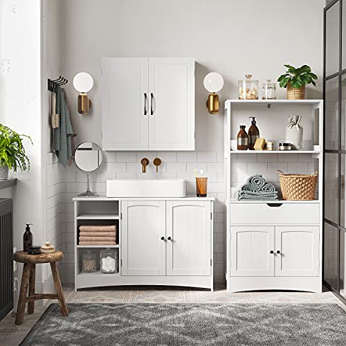Frischer Wind fürs Bad: Die weiße Farbe, die Schranktüren mit speziellen Rillen und die verchromten Metallgriffe verleihen diesem Badschrank ein unverwechselbares Aussehen. Ab neuartig weht ein frischer Wind in Ihrem Badezimmer!